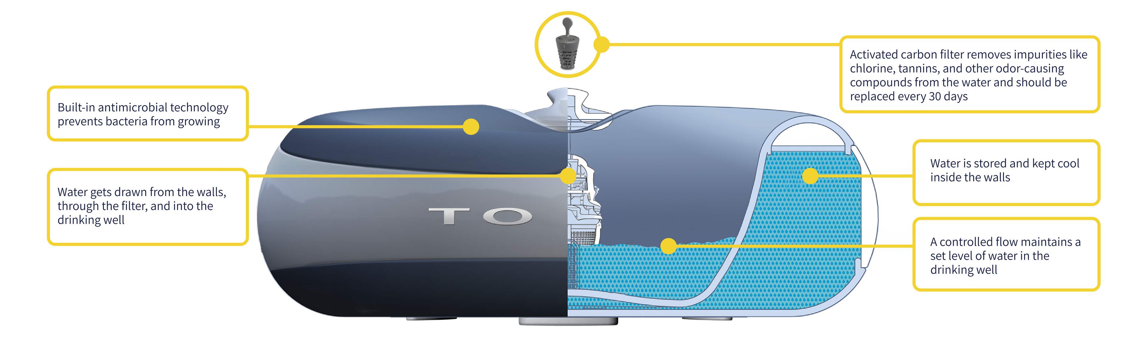 The unique, portable, filtered water dispenser that stores water in its walls and automatically refills when your pet drinks.